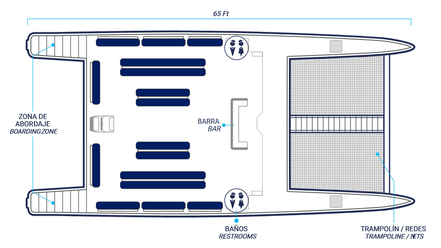 This new mega catamaran charter 65ft will comfortably accommodate big groups of people for Wedding celebration on a boat in Cancun. At this roomy catamaran there are lot's space for dancing and it has comfortable benches to sit and a big net to lay down and enjoy the sun. Sitting area at the catamaran is covered with tent. The crew will serve you drinks and make your journey comfortable and memorable. Reserve this 65ft private catamaran charter in Cancun today for life-time memories!